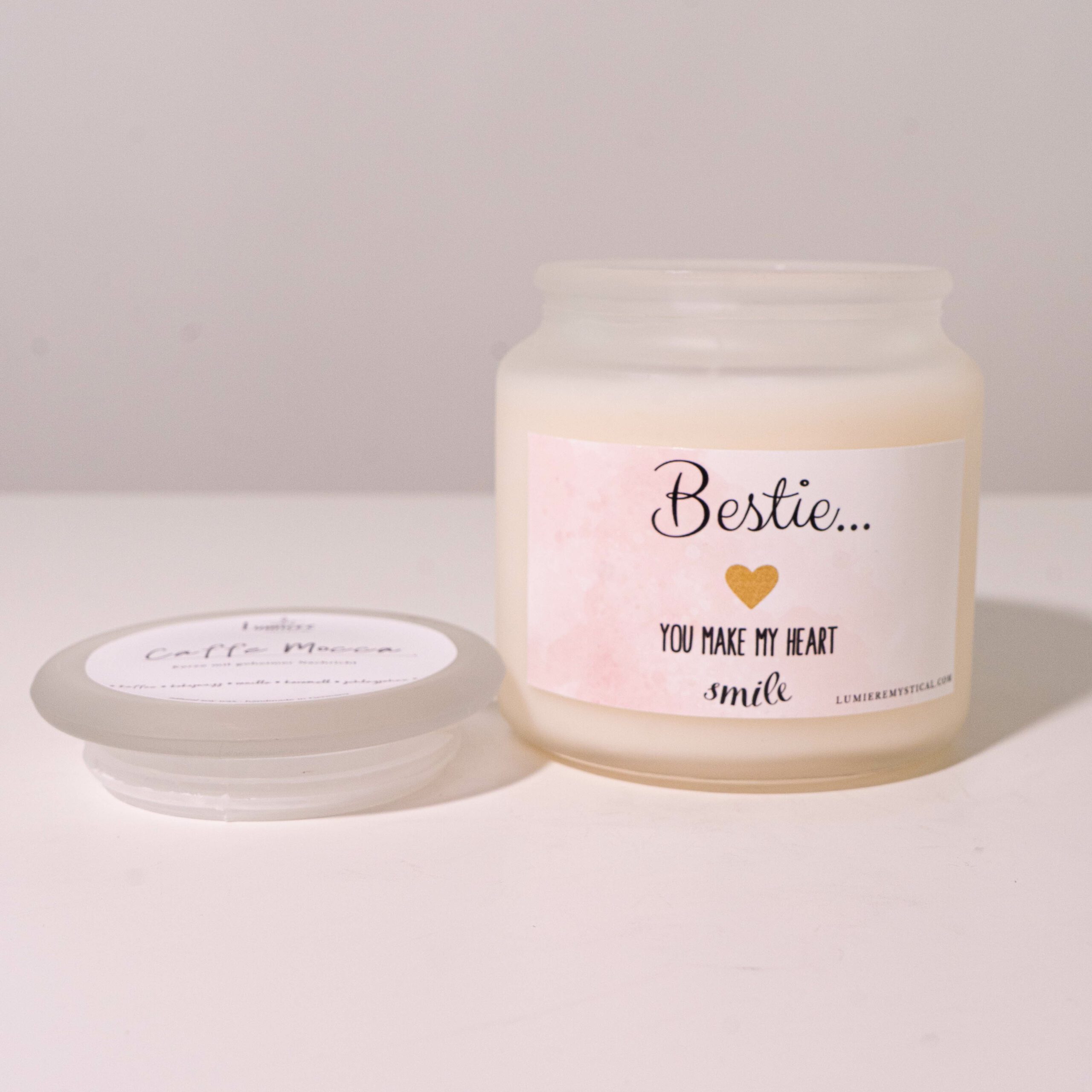 Diese Kerze ist eine fröhliche, handgefertigte Kreation, die die Freude der Freundschaft und die besondere Bindung feiert, die Sie mit Ihrer besten Freundin teilen. Hergestellt in Deutschland mit sorgfältiger Handwerkskunst, besteht sie aus 100% natürlichem hochwertigem Sojawachs für ein sauberes, gleichmäßiges Abbrennen, das Ihren Raum mit einem warmen, einladenden Schimmer erfüllt.