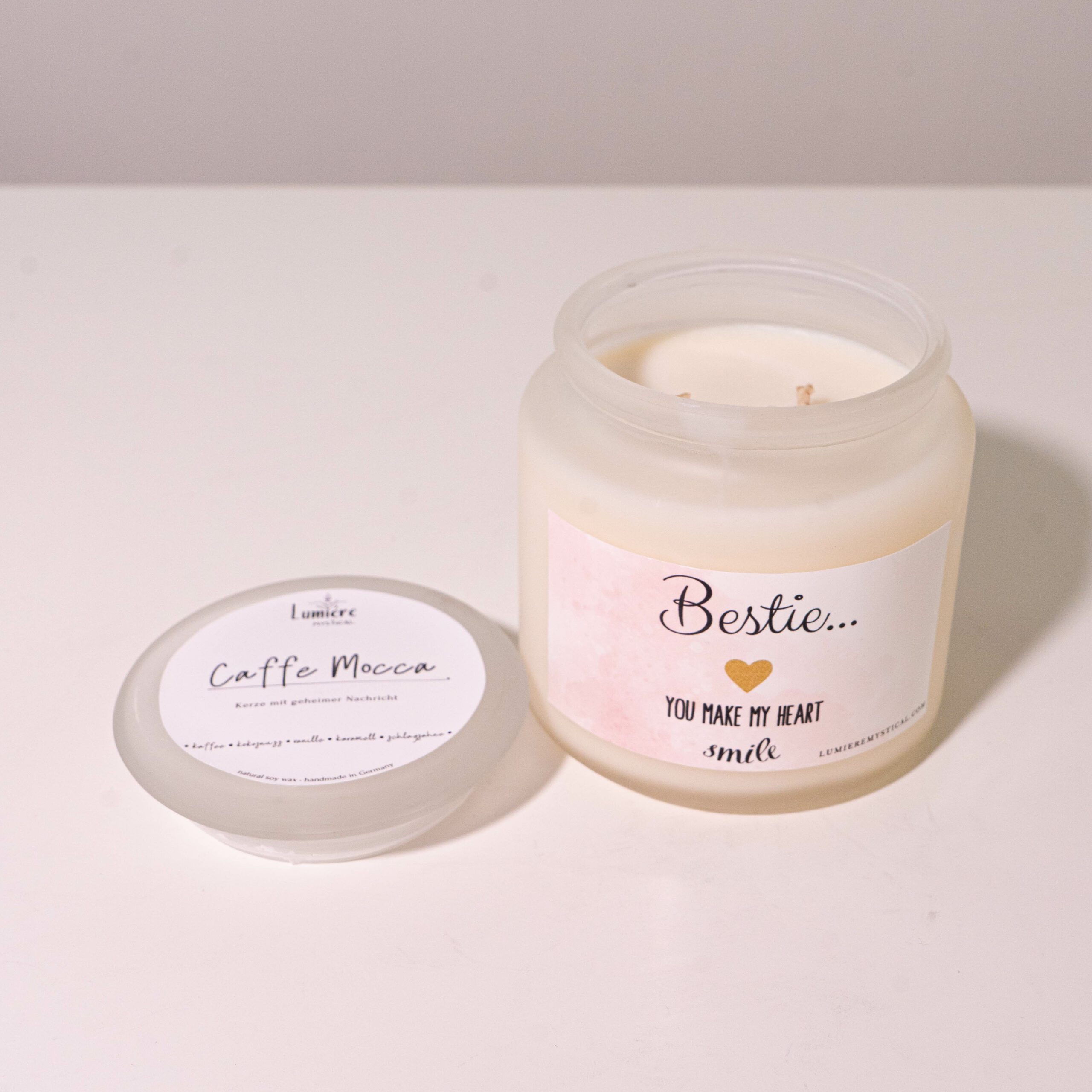 This candle is a cheerful, handcrafted creation that celebrates the joy of friendship and the special bond you share with your bestie. Made in Germany with meticulous craftsmanship, it is composed of 100% natural high-quality soy wax for a clean, even burn that fills your space with a warm, inviting glow. As the candle burns, it reveals a secret message hidden within its core, adding an element of surprise and delight to your experience. The secret message is customizable, allowing you to add a personal touch with a note that reflects your unique friendship and the special connection you share. Perfect for celebrating moments with your best friend or simply reminding them how much they mean to you, this candle is a thoughtful gift for your bestie or a cheerful addition to your own space. With its natural wax and careful craftsmanship, it is sure to bring warmth and a smile to your heart wherever it is lit.
