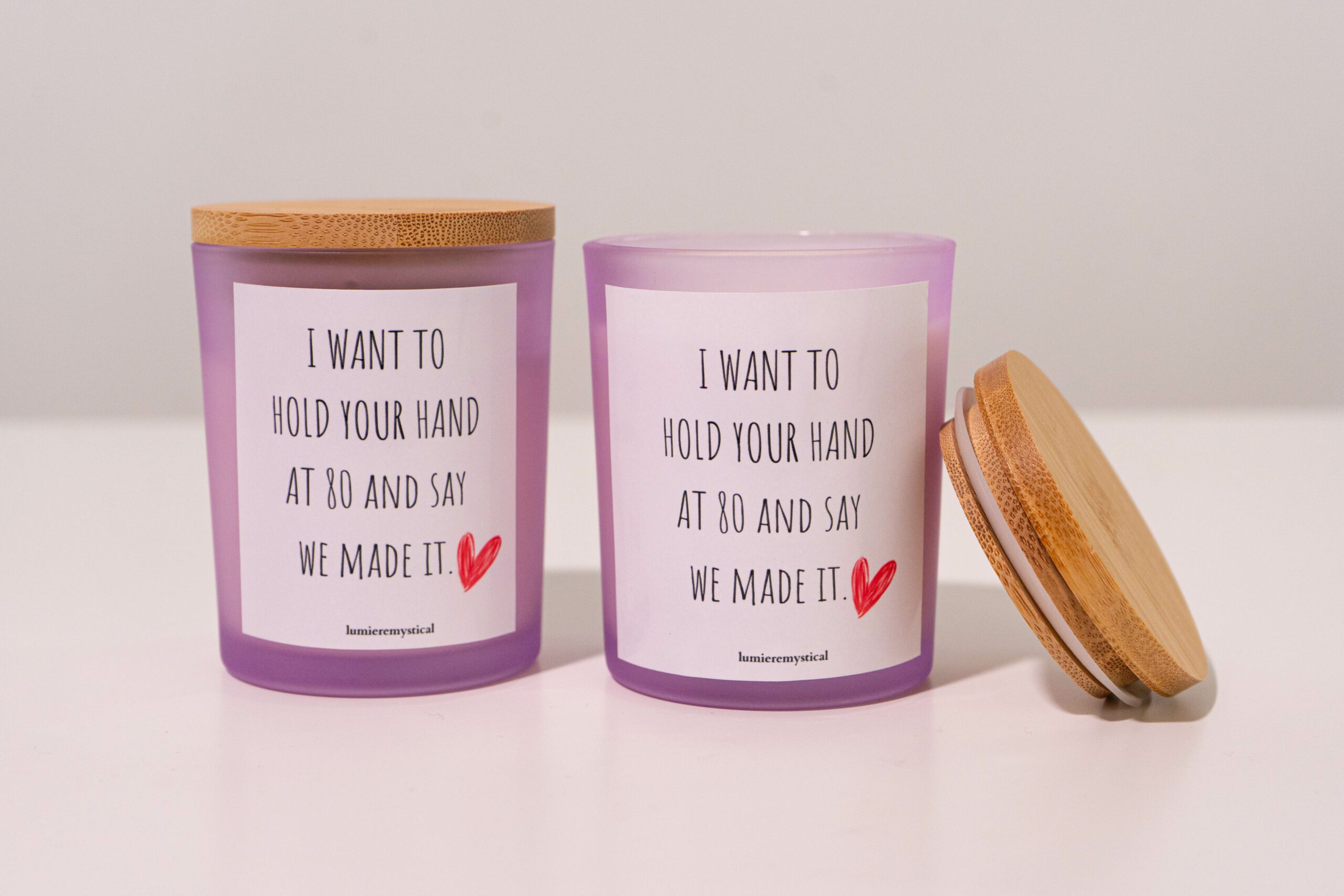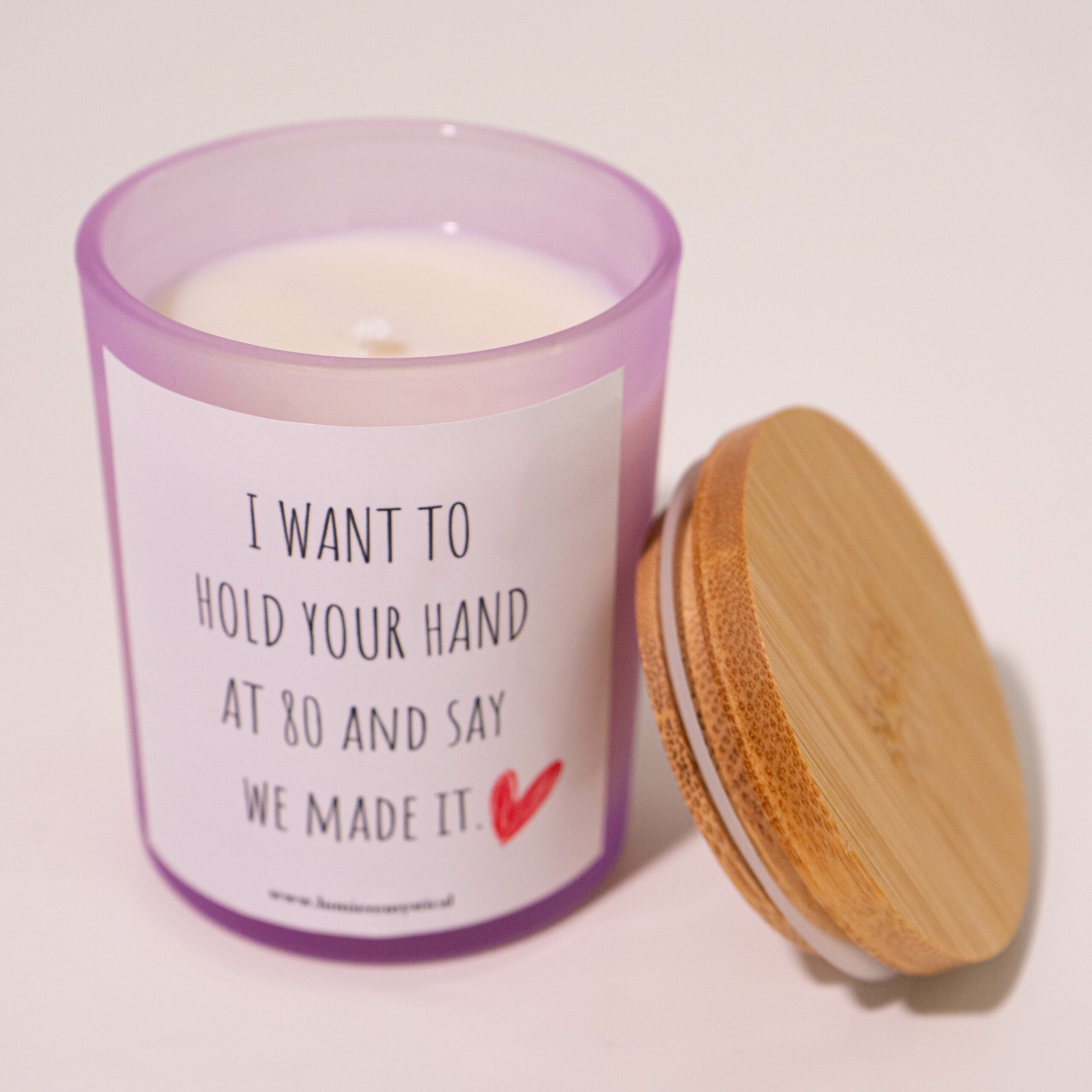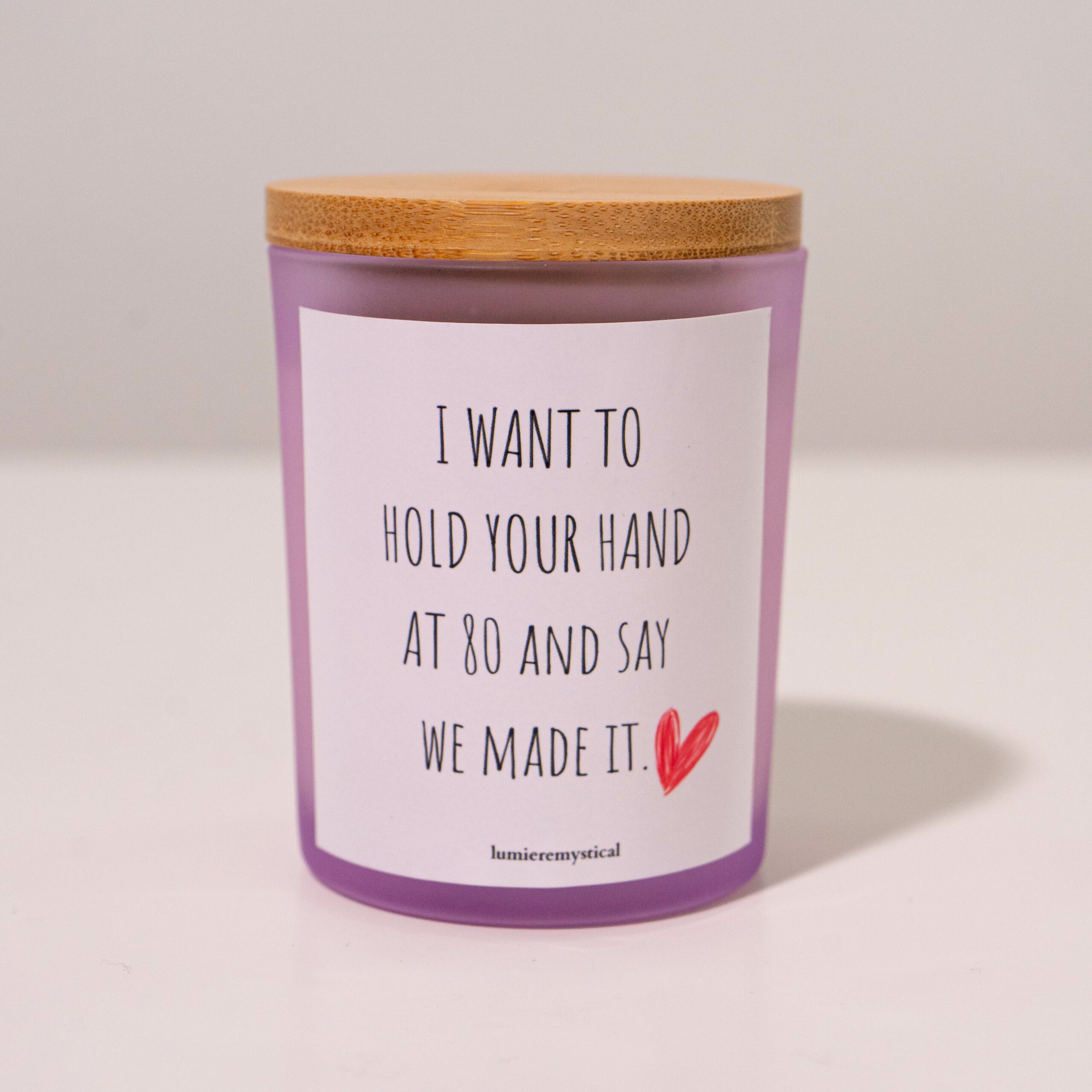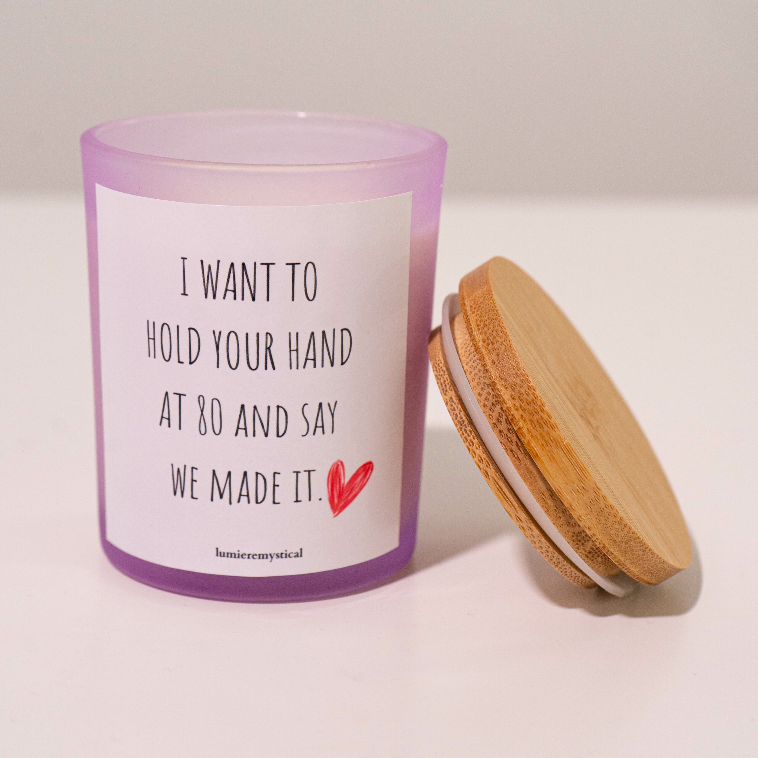 This candle is a heartfelt, handcrafted creation that celebrates enduring love and the dreams of a long, fulfilling journey together. Made in Germany with meticulous craftsmanship, it is composed of 100% natural high-quality soy wax for a clean, even burn that fills your space with a warm, comforting glow. As the candle burns, it reveals a secret message hidden within its core, adding an element of surprise and heartfelt sentiment to your experience. The secret message is customizable, allowing you to add a personal touch with a note that conveys your commitment to a shared future and the beauty of growing old together. Perfect as a gift for a special partner or for a milestone anniversary, this candle captures the essence of a lasting relationship. With its natural wax and careful craftsmanship, it brings a cozy and romantic ambiance to your home as you envision a future of holding hands and celebrating your love at every stage of life.